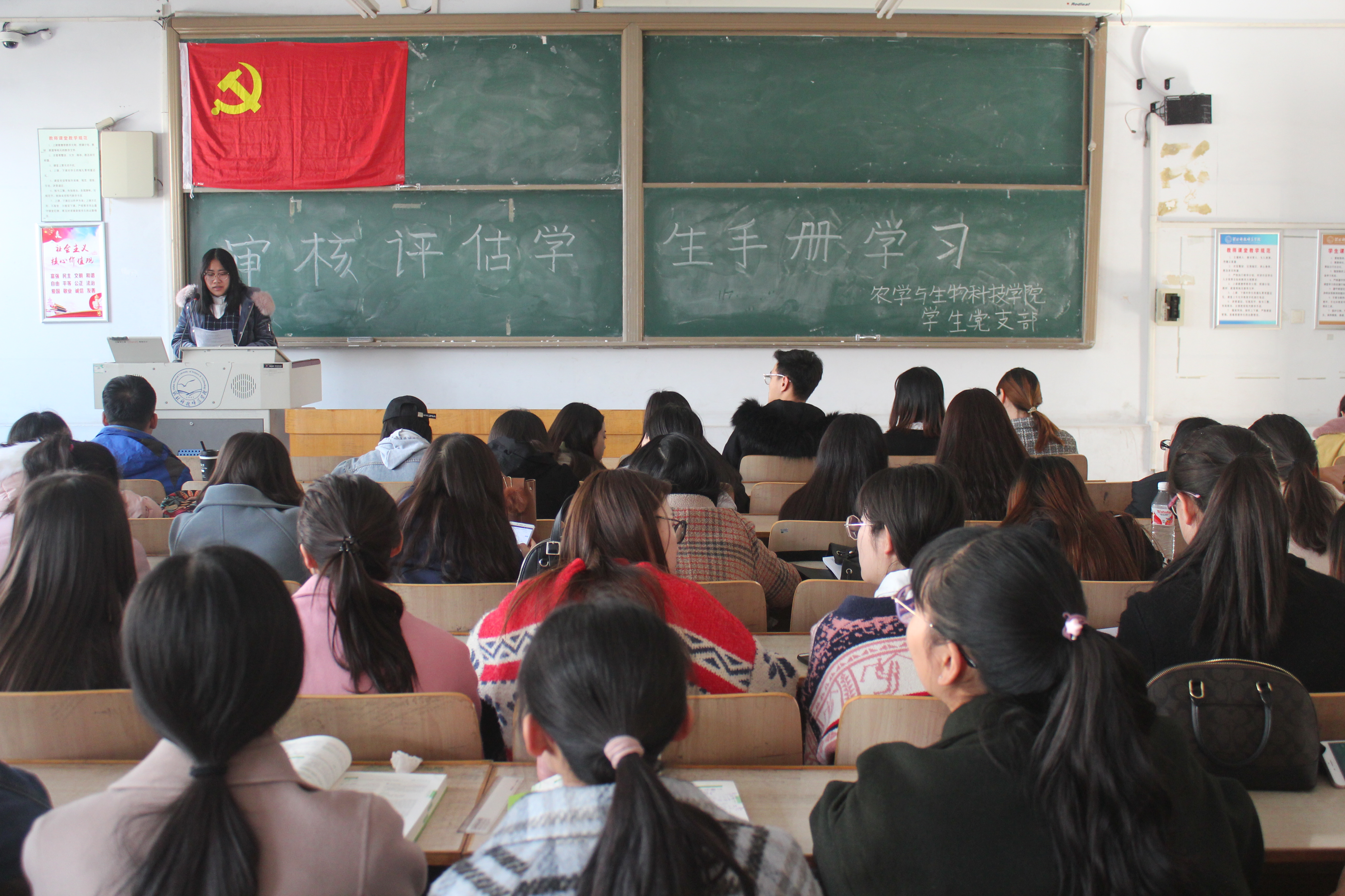 5名同学分别登上讲台带领大家逐条学习了评估手册中评估工作应知应会、学校基本情况简介、学生评估注意事项等三部分主要内容。